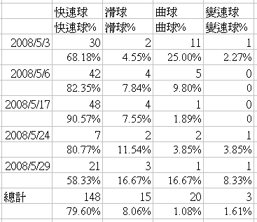 另外,郭泓志也為我們示範,何謂英文所謂的「Power Pitcher」,以大量快速球對決的高三振率投手,這對台灣傳統棒球觀念,又是一大衝擊,請參考我列的球種紀錄。