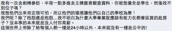 「我有一次去劍橋參訪,半夜一點多 進去主棟圖書館查資料,你能想像全是學生,然後找不到位子嗎?我想他們出來肯定很可怕,所以他們的環境讓他們以自己的學校為榮!我們呢?除了抱怨還是抱怨…我不明白為什麼大學畢業就應該有能力在都會區買的起房子?沒本事的本來就是沒人付你高薪。這個世界上帝除了給每個人都一樣是24小時以外,本來就沒有一樣是公平的!」