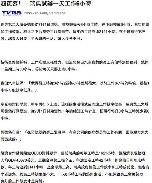 昨天奇摩新聞平台,當中連結的TVBS(個人建議是,奇摩和TVBS這兩個媒體都沒有常看的價值,更佳的替代品比比皆是)報導了這條新聞:《超羨慕! 瑞典試辦一天工作6小時》。