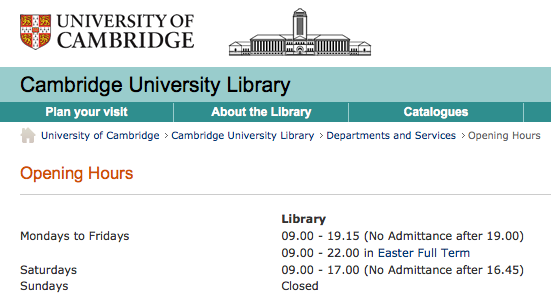 劍橋大學圖書館開放時間,不但沒有開到半夜一點,反而晚上十點就關門了。半夜一點見到的滿間學生,真的不是見鬼嗎?