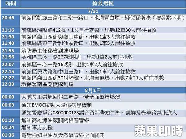 從有氣體外洩的跡象出現,再到大爆炸,間隔有3個小時左右,這段時間高雄市派出一堆消防車和人力到達附近,後來連消防局主秘都到了,一堆市民也察覺到狀況不對,然而由於無法確認外洩的氣體與地點,所以除了讓消防隊灑水之外也不能幹什麼。後來終於查出是丙烯,可惜大量丙烯早已進入下水道,並沿線擴散,終於在午夜左右爆炸。