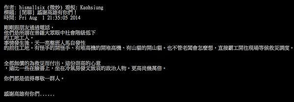 不多說什麼,大家來為死難的高雄市民默哀,替盡職的消防隊員致敬。