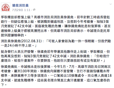 最後再來講些其他東西,台灣的消防、警察與醫護,長期都處於資源不足的狀況,而基層永遠都是被壓榨的一群,高雄市消防隊前天也上了新聞: