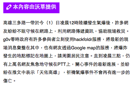 台灣有這麼多善心人,遺憾的是,懷抱惡意的傢伙也不缺。某個PTT版面長期被某黨的網軍佔領,並聚集了一幫活在平行宇宙的星際異攻隊,平時打打嘴炮就算了,竟然連在這種大災難發生的當下,都還極儘抹黑之能事,事後更是冷嘲熱諷,就因為高雄市是民進黨執政。這種黨同伐異,只問顏色,不管是非,無情冷酷,心中不關心同胞死活的態度,宇昌案就見得多,沒想到連死傷慘重的爆炸案都來這套,實在是可惡至極。