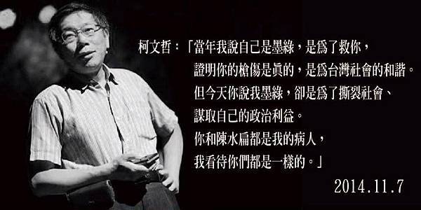 在這個過程中,我非常感謝台大醫院,而最該感謝的,正是我目前的對手柯文哲,柯醫師,沒有他,我現在沒有辦法站在這裡,沒有他,我的父親母親將永遠失去兒子, 我的妻子依姍將失去丈夫,我的兩個小孩定捷與安捷,將失去父親。幸好有台大醫院,幸好有柯醫師,沒有人比我更知道柯文哲醫師的價值,他是台灣最好的醫師, 適合留在台大醫院的崗位上,拯救那些需要的人,就像當時在手術台上的我一樣。